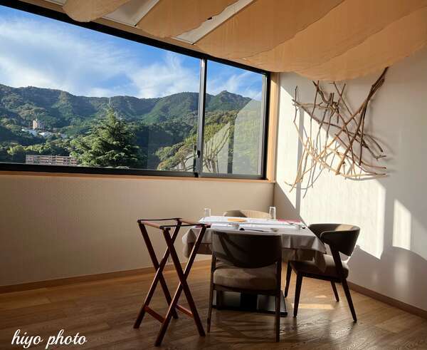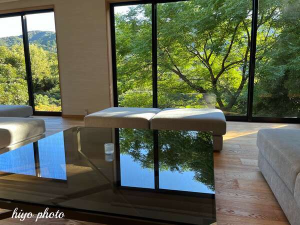 ゆったりと座れるダイニング、光と水が演出するバーカウンターは、森がパノラマに広がる特等席です。引用:三輪 湯河原