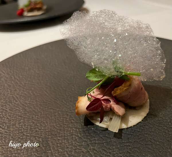 すだちの香りの泡を鴨肉に絡ませながらいただく鴨肉のローストです。